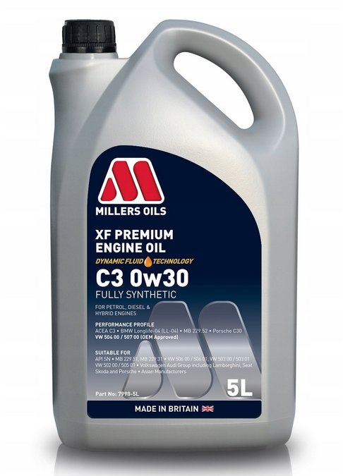 Olej silnikowy klasy premium wykorzystujący technologię Millers Oils DFT (Dynamic Fluid Technology) do silników wymagających oleju C3 o lepkości 0w30. Oficjalna aprobata OEM. Opracowany dla Volkswagen Audi Group (VAG), w tym także: Lamborghini, Seat, Skoda, Porsche.