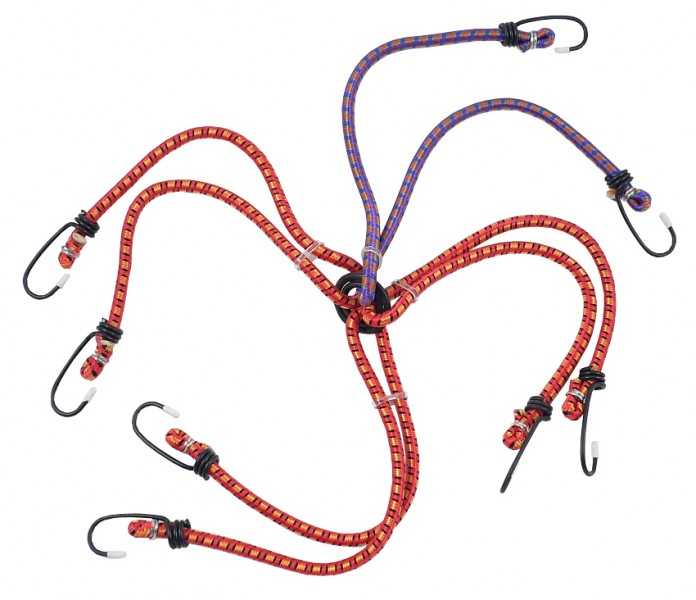 Spinacz elastyczny 8-ramienny przeznaczony do dodatkowego mocowania niewielkich ładunków transportowych przewożonych w bagażnikach samochodowych, rowerowych etc.
